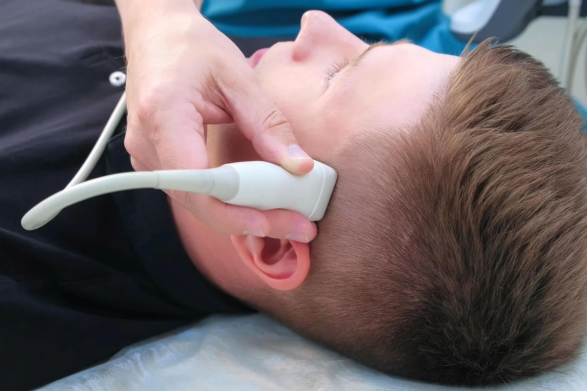 Ārsts uzklāj gēlu un ar ultraskaņas zondi pārbauda galvas un kakla asinsvadus.